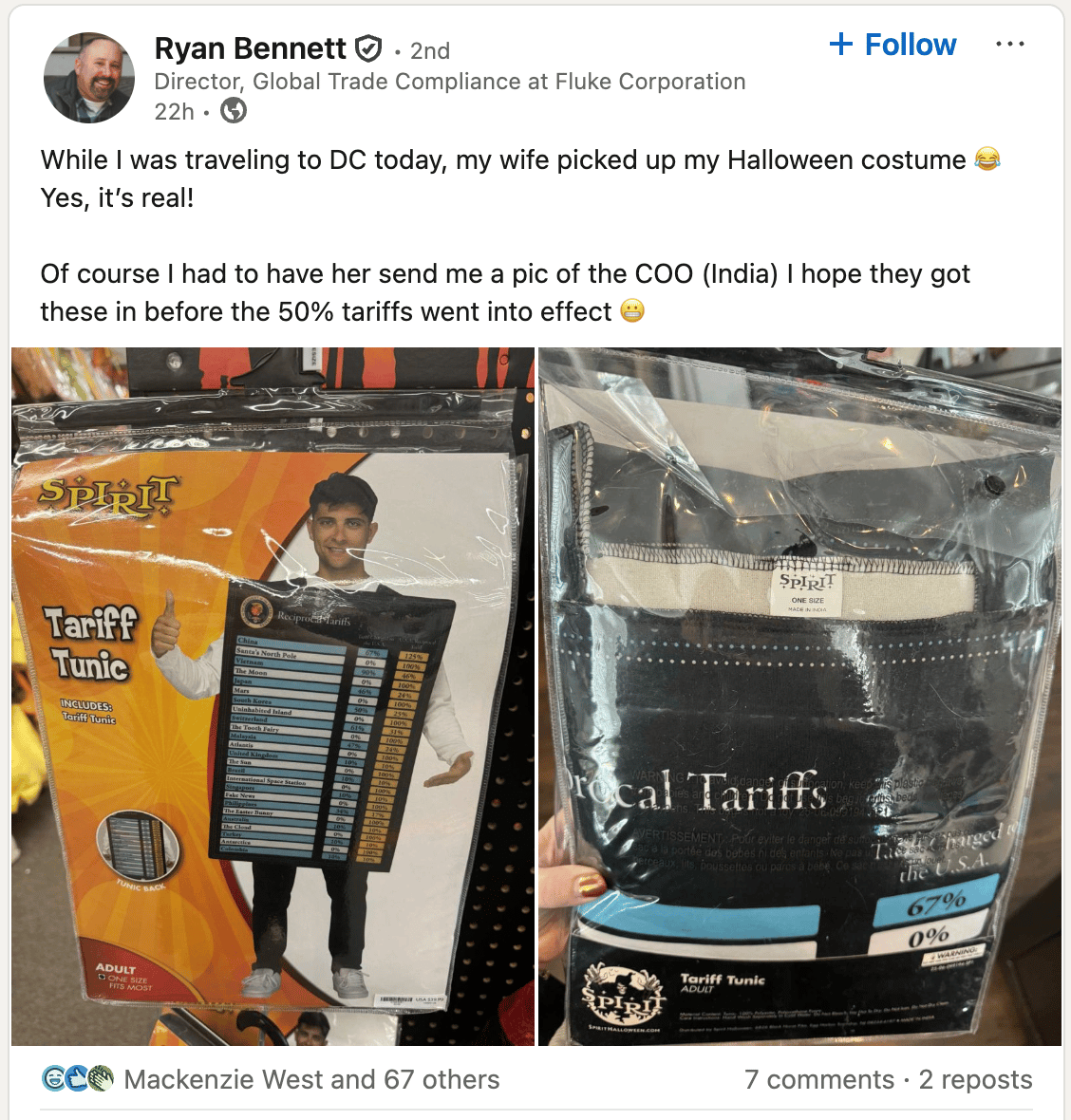 Ryan Bennett found this gem at Spirit Halloween. COO India (50% tariff) has us dying. What is that irony? 👇