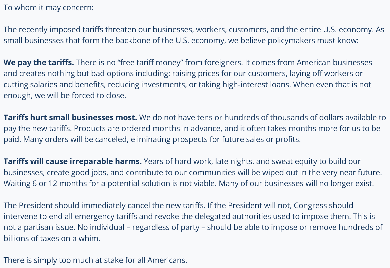 Tariffs are raising costs and risking jobs for many. Your voice can help lawmakers understand the real impact. If you want to join the effort, sign the petition letter at wepaythetariffs.com/sign-the-letter.